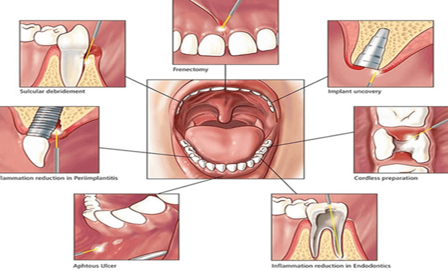 – *ضدعفونی عمیق*: لیزر قادر است باکتریها را در عمق پاکتهای لثهای نابود کند.